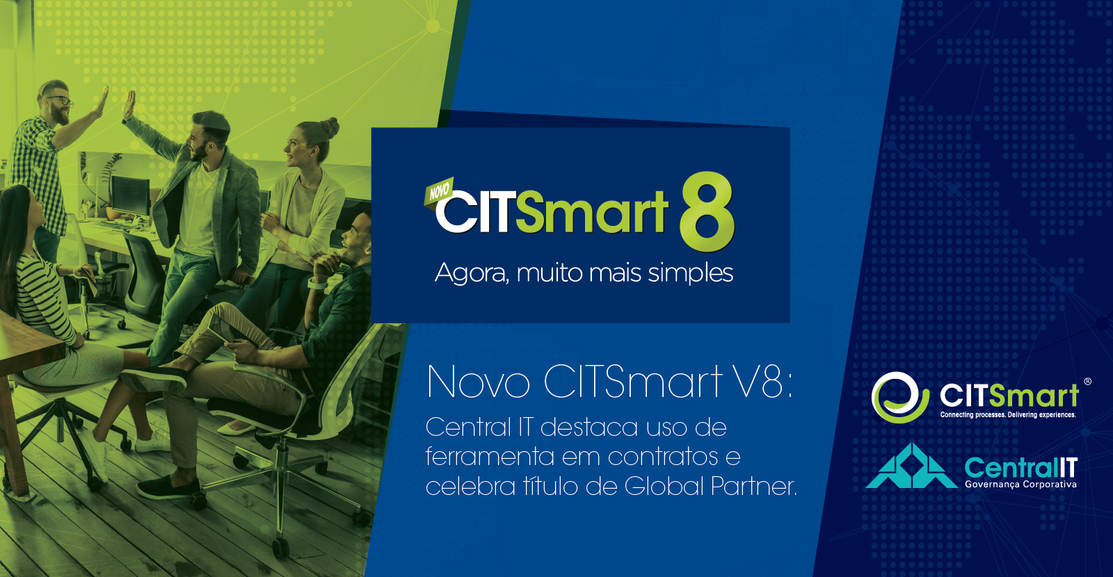 Simultaneamente ao evento, a Central IT, que é Global Partner da companhia e principal player de negócios, com casos de sucesso utilizando a ferramenta, recebeu uma apresentação de kick off da V8 , no mercado. O CEO da CITSmart Corporation Emauri Gaspar, junto ao CPO Valdoílo Damasceno e ao Partnership Manager Vinícius Gravito, conduziu uma apresentação detalhada sobre as mudanças que acompanham a solução, bem como as melhorias implantadas e novas funcionalidades inseridas. Em sua fala, Emauri enfatizou o impacto do conceito de workflow e a importância do tratamento da Tecnologia da Informação como um elo de ligação e sustentação dos processos de uma organização, ou seja, ela facilita e é parte integrante do negócio.